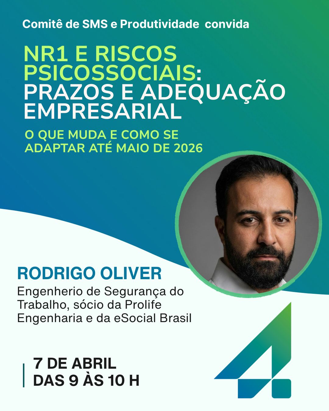 No dia 7 de abril, das 9h às 10h, receberemos Rodrigo Oliver, Engenheiro de Segurança do Trabalho, sócio da Prolife Engenharia e da eSocial Brasil, para esclarecer os principais pontos da NR1, os impactos na gestão empresarial e os caminhos para uma implementação eficaz.